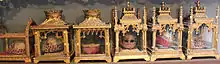The walls of the Golden Chamber are covered in bones arranged in designs and/or letters along with relic skulls. The exact number of people whose remains are in the Golden Chamber remains ambiguous but the number of skulls in the reliquary is greater than 11 and less than 11,000. These remains were found in 1106 in a mass grave and were assumed to be those of the legend of St. Ursula and the 11,000 virgins. Therefore, the church constructed the Golden Chamber to house the bones. The bones themselves are neatly arranged in "zigzags and swirls and even in the shapes of Latin words."[3]