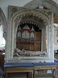 Within the church is the very fine late 15th century alabaster tomb of John Harington, 4th Baron Harington (1384–1418) who fought alongside King Henry V in France in 1417,[5][6] and his wife Elizabeth Courtenay (died 1471), daughter of Edward de Courtenay, 3rd Earl of Devon (died 1419).[3] Elizabeth survived her first husband and married secondly William Bonville, 1st Baron Bonville (died 1461). The style of armour worn by Baron Harington is of the period c.1470, as was worn in the time of his widow's death, and is not therefore an accurate representation of the armour worn at the time of his death in 1418.[7][8] The monument and effigies are believed to have been erected at the expense of Elizabeth's step-daughter the great heiress Cicely Bonville, Baroness Harington and Marchioness of Dorset (1460–1529), and are considered from their very high quality "more befitting a cathedral than a retired country church".[9] At the back of the nave is a clock dating from the early 15th century which struck the tenor bell hourly. It has no hands or clock face. The clock was used until 1897 when a new clock was installed to celebrate Queen Victoria's jubilee.[3]
