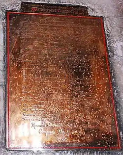 In 1724 work began to change the church roof from tiles to lead, work that was completed in 1758; until this point the church had a three-span roof but this work saw the roof assuming the one-span structure that is maintained to the current day.[22] In 1742 the plain window on the northern wall behind the pulpit was replaced "with a Square Crown Glass in order to give it better light, and also to alter the Sounding Board in such a manner as shall be thought most proper upon the opinion of the Revd. Mr. Smith, Vicar, and the workman."[22] According to Couper, the housekeeping records during this century became "more meticulous than ever"; records were kept of the monies received for each member of the congregation ("1/- for each person 'seated' in the Church or Churchyard, and 3/4 for a child's")[23] as well as for items such as "a pound of soft soap" (7d), "oyle" (3d) and "a chamber pott" (9d).[23]