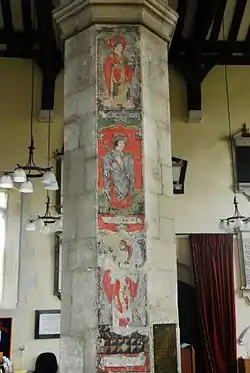 The 15th century saw a great number of extension and additions to St Lawrence's, including: the new northern nave – this was of roughly the same proportions as the existing southern nave, and made the church, in Pevsner's words, "essentially a parallelipiped [sic]";[3] what was previously the north wall to the old church was demolished and seven arcades were installed in its place, with three paintings of saints (pictured, left) remaining on the northern side of the second pillar from the west; new roofs over both naves; windows recast in the Perpendicular style; carved screens to choir and altar, and rood screen; a spire on top of the old tower.[9] The exterior of the church (apart from the Victorian broach-spire) also dates from the 15th century,[3] and is fashioned from local flint and stone covered with plaster.[10] A chapel was also constructed in the southern nave, which is the current choir vestry,[11] as well as a chapel to the north of the choir called the Champflour Chantry Chapel (of which only a stone fragment remains). The royal licence for the building of this chapel was issued on 20 October 1463: