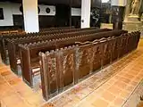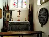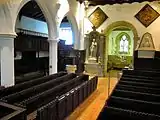 The carved wooden pulpit shows Jesus with children and the Woman of Samaria and is probably 18th century Flemish. It was purchased by Frank Shuttleworth from an antique shop in Edinburgh. Originally it had carvings of the signs of the Four Evangelists on the four pilasters but these were stolen in 1997.[3] The wooden panels on the front of the altar are late 19th century. The serpents on the front pew are of particular note. One was damaged during the burglary of 1997 and was repaired by local craftsmen while the second was stolen and subsequently replaced. The large box pew at the top of the nave opposite the pulpit was the Shuttleworth Family pew and contains a fine carving of the Women preparing the body of Christ. Above this is a large and ornate baroque carving representing Faith, erected by her sister in memory of Caroline Jane Shuttleworth, who died in 1899.[4]