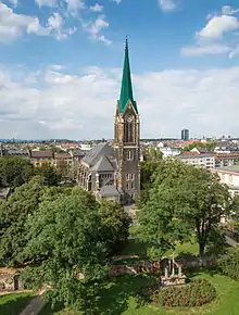 The church built between 1891 and 1894 on a neo-renaissance design by Hans Grisebach and Georg Dinklage.It was built on the site of the historic St Peter's Churchyard(German: Peterskirchhof), where most of Frankfurt's dead was buried until 1828.[1]