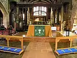 The church is built of squared red sandstone rubble with stone dressings. It features Delabole slate roofs with gable ends. The nave and chancel have narrow aisles which are flat-roofed to the north. The asymmetrical placed transeptal tower stump is covered with a saddleback roof. The north aisle was completed in 1965 due to a lack of funds previously.[4] The aisles have low three-light windows. The chancel is slightly narrower than the nave and has three-bay arcades and a waggon roof with carved corbel bosses at the east end. There is an elaborate wooden chancel screen with grille; the octagonal baptismal font with fleuron decoration dates to 1916. The pulpit is slightly earlier, dating to 1914. The sedilia has quatrefoil windows to the chancel of two seats and the piscina to left has a scalloped base.[2][6]