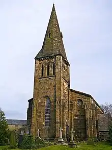 When the foundation stone was laid in 1869, this Gothic Revival Anglican church was said to have been designed "in the geometric decorated style."[8] It is built of hammer-dressed stone with ashlar dressing. The stone gutter of the slate roof is on moulded brackets. The tower is at the east end of the nave, and it has a stair turret to the second floor on its west side and a splay-footed stone spire with four lucarnes. Over the south door is a canopied niche with a "moulded arched head and figure" beneath.[1]