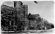 Three hundred persons then enjoyed luncheon served in a marquee in the next-door field, alongside the road. There were many speeches, including a long one from the Earl: this time discussing church and laity, flattering the clergy and mentioning the Irish Church Bill. A number of toasts were given, drunk and responded to at length. A toast was made to the architects and Barber responded, concluding the speeches with a toast to the ladies.[8][9]
