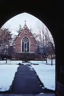 Thompson was educated at Queen's College, Birmingham, graduating in 1863.[35] On 29 June 1865 he was ordained deacon by the Bishop of Ripon in the chapel of the Episcopal Palace at Ripon.[43] He was ordained priest on Sunday 22 September 1867 by the Bishop in the same chapel.[44] From 1865 to 1868 he was curate of Longwood, West Yorkshire.[35] In 1868 the vicar of Kirkburton, Rev. Richard Collins (1794–1882),[45] appointed him curate of the chapel of ease at Thurstonland, in anticipation of his incumbency of the new parish of Thurstonland and its projected Church of St Thomas, which was to be completed in 1870. In June 1868 the Bishop of Ripon licensed him to the stipendiary curacy of Kirkburton, to officiate in Thurstonland.[46][47] Thus Thompson was the first curate of Thurstonland to use the new church building.[3] He was formally granted the vicarage of St Thomas in May 1871 where he served until 1877.[35][48]