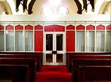The entrance area and aisle are paved with coloured, plain encaustic tiles whose layout pattern was designed by Mallinson and Barber; the floor under the pews retains its original floor boards.[27] The organ was made by F.W. Jardine for Kirtland and Jardine in 1870, and was fully restored in 1990. It fits into the organ arch, which was designed for its dimensions.[3][18][28][29] The original 1870 carved oak pulpit on its carved stone plinth stands in its original position in front of the north side of the chancel arch.[30] Many of the original pews designed by Mallinson and Barber still exist in situ, but the ones at the back of the nave were removed along with the marble font in the 1980s when the church room was constructed there.[31]