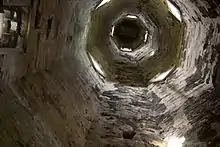 Above the bell frame there is a hole in the bell chamber ceiling, and through that opening can be seen the inside of the spire. It is a hollow cone of stone blocks, unsupported by any interior frame, and is full of light because it has four lucarnes at the bottom, and eight more large openings higher up.