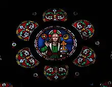 The east window by William Wailes represents the Parable of the Good Samaritan; it cost £100 and was funded in 1870 by the local inhabitants in memory of Thomas Brooke, father of the 1869–1870 fund-raising treasurer Colonel Brooke. Rev. Richard Collins stated at the 1870 consecration that the theme of Good Samaritan and the word "just" in the window's dedication referred to Thomas Brooke's good deeds.[3] The reredos was installed in the 1920s, and on its bottom right hand skirting board there is a wooden plaque commemorating its presentation.[32] The sanctuary has decorative encaustic floor tiles whose arrangement was designed by Mallinson and Barber. These tiles were funded by D. Sharman who was master of Thurstonland Endowed School. The choir stalls and the altar rail are decoratively carved, and were designed and commissioned by Mallinson and Barber.[33]