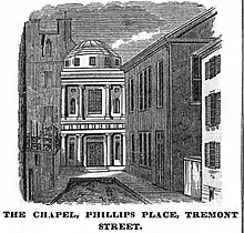 Church of the Disciples was a Unitarian church located in Boston, Massachusetts. It was founded by James Freeman Clarke early in 1841. The first public step taken by Clarke was preaching three times in the Phillips Place Chapel, with the purpose of forming a new religious society. The first meeting subsequent to organization was in a part of Amory Hall. The congregation soon outgrew the room and for a while, they met at Ritchie Hall. When they were able to secure the whole of Amory Hall, they returned to it. When it became too small for their increasing numbers, they went to the Masonic Temple. Though an internal split occurred in 1845, the congregation was ready to build its own structure in 1847, the Freeman Place Chapel.