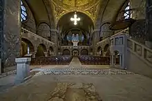 The Church of the Redeemer (German: Erlöserkirche) of Bad Homburg belongs to the Protestant Church in Germany. Finished in 1908, the building is outwardly of a heavy, Romanesque Revival appearance, while its interior is in a neo-Byzantine style, with rich marble wall decorations and gold mosaics covering the domed ceiling, leading to the church sometimes being called 'Bad Homburg's Hagia Sophia'.[1]