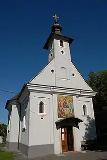 The church was built using a Baroque style[2] in 1795–1796, with help from the Romanians of Brașov and Wallachia. The first liturgy was celebrated at Christmas 1796, when the church was consecrated. The church is small, 19 meters long by 9 meters wide, with a spire reaching 19 meters. The vestibule is rectangular, the nave octagonal, the choir narrow; the altar is semicircular in the interior and polygonal in the exterior. The iconostasis was painted in 1796 by the well known Constantin the Painter, a deacon from Șcheii Brașovului and sent as a gift by the merchants of Brașov.[1]