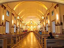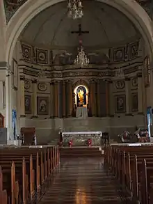 The main and side retablos are in Neo-classical design. The image of San Isidro Labrador is enthroned in the high main altar. The image of Saint Joseph is enthroned in the gospel retablo while the image of the secondary patron, Our Lady of the Most Holy Rosary is enthroned in the epistle retablo.