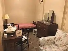 Churchill's office-bedroom, open from 27 July 1940,[24] included BBC broadcasting equipment; Churchill made four wartime broadcasts from the Cabinet War Rooms, the first being on 11 September 1940.[25] Although the office room was also fitted out as a bedroom, Churchill rarely slept underground,[26] preferring to sleep at 10 Downing Street or the No.10 Annexe, a flat in the New Public Offices directly above the Cabinet War Rooms.[27] His daughter Mary Soames often slept in the bedroom allocated to Mrs Churchill.[28]