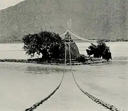 By the 1860s, the bridge was in a state of disrepair that a ferry was in operation slightly upstream offering safer passage.[1] By 1904, the river had overflown the north bank leaving the northern bridgehead on an island, thus rendering the bridge functionally ineffective.[6] The ferryman mostly came from a nearby village of Chun or Junba, which is the only fishing village in Tibet.[7][8][9] The ferry service continued as late as 1959.[7]