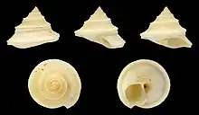 The shell is solid, trochiform and dirty whitish in color.[6] The spire is acutely conical.[6] The shell has 6 or 7 feebly concave whorls.[6] They are bearing arcuate and flexuous lines of growth and six or seven granulous lirae, whereof that immediately above the suture is the largest.[6] The body whorl is acutely angular at the periphery, encircled by two subequal granular ridges.[6] The base is concave near the circumference, then slightly convex, concentrically granosely ridged.[6] The ridges nearest the umbilicus are coarser than the others, and also arcuately radiately striated.[6] The shell has deep and narrow umbilicus.[6]