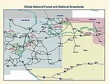 The Cibola National Forest (pronounced SEE-bo-lah) is a 1,633,783 acre (6,611.7 km2) United States National Forest in New Mexico, USA. The name Cibola is thought to be the original Zuni Indian name for their pueblos or tribal lands. The name was later interpreted by the Spanish to mean "buffalo."[3] The forest is disjointed with lands spread across central and northern New Mexico, west Texas and Oklahoma. The Cibola National Forest is divided into four Ranger Districts: the Sandia, Mountainair, Mt. Taylor, and Magdalena. The Forest includes the San Mateo, Magdalena, Datil, Bear, Gallina, Manzano, Sandia, Mt. Taylor, and Zuni Mountains of west-central New Mexico. The Forest also manages four National Grasslands that stretch from northeastern New Mexico eastward into the Texas Panhandle and western Oklahoma. The Cibola National Forest and Grassland is administered by Region 3 of the United States Forest Service from offices in Albuquerque, New Mexico. Elevation ranges from 5,000 ft (1,500 m) to 11,301 ft (3,445 m). (The preceding figures do not include any of the four National Grasslands mentioned below, which are detailed in their individual articles.) The descending order of Cibola National Forest acres (not counting the three Grassland areas) by county are: Socorro, Cibola, McKinley, Catron, Torrance, Bernalillo, Sandoval County, New Mexico, Lincoln, Sierra, and Valencia counties in New Mexico. The Cibola National Forest currently has 137,701 acres designated as Wilderness. In addition to these acres, it has 246,000 acres classified as Inventoried Roadless Areas pursuant to the Roadless Area Conservation Rule.[4]