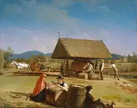 By the 18th century, apple cider was a staple at every family table; at harvest many apples were pressed into cider, the remainder placed carefully into barrels to store through winter for eating or replenishing supply. Pehr Kalm, a Swedish naturalist, noted in his travels in 1749 that nearly every home on Staten Island had a small orchard attached and in the colonial capital, Albany, apples were being pressed for cider to be exported south to New York City. [18] Settlement along the frontier often included a legal requirement whereby an orchard of mature apple trees bearing fruit within three years of settlement were required before a land title was officially granted. For example, The Ohio Company required settlers to plant not less than fifty apple trees and twenty peach trees within three years. These plantings would guarantee land titles. In 1767, the average New England family was consuming seven barrels of hard cider annually, which equates to about 35-gallons per person.[19] By 1775, one in ten New England families, most of them farmers, had a cider mill on the property.[13] In one of his letters to his wife, Abigail, John Adams complained about the quality of Philadelphia alcohols and of being homesick for her cider.[20][21] Thomas Jefferson grew several varieties of apple at his home in Virginia and his wife Martha Jefferson oversaw their harvest and brewing while she was mistress of the plantation.[22] Ciderkin, a slightly alcoholic beverage made from cider pomace, could also be found on colonial tables, and was often served for breakfast. Applejack, made in the North, was made in a similar manner to Canadian ice cider every winter as an alternate means to concentrate alcohol when it was far too cold outside to bring out the cider press.[23]