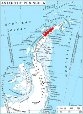 The Important Bird Area (IBA) lies 50 km to the east of Brabant Island, with Cierva Point forming both the northwest extremity of Sladun Peninsula and the south side of the entrance to Cierva Cove. The IBA is defined by the same boundary as Antarctic Specially Protected Area (ASPA 134) which includes Cierva Point, Midas Island, Sterneck Island, Moss Islands and other offshore islands as well as the intervening sea and intertidal zone. At Cierva Point the south-facing slopes are glaciated, whilst the north- and west-facing slopes are ice-free. The land rises to over 500 m at the coastal cliffs. The Argentine Primavera Station lies close to the IBA boundary on the northern tip of Cierva Point.[1]