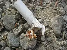 Cigarette butts are the most littered anthropogenic (man-made) waste item in the world. Approximately 5.6 trillion cigarettes are smoked every year worldwide.[25] Of these, it is estimated that 4.5 trillion cigarette butts become litter every year.[26] The plastic cellulose acetate in cigarette butts biodegrade gradually, passing through the stage of microplastics.[27] The breakdown of discarded cigarette butts is highly dependent upon environmental conditions. A 2021 review article cites an experiment where 45-50% of cellulose acetate mass was fully degraded to CO2 after 55 days of controlled composting and another where negligible degradation took place after 12 weeks in pilot-scale compost.[28][29][30]