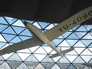 The Orao, originally without a type number, first flew in 1948. After the national championships it underwent some small modifications, chiefly the removal of dihedral from the tailplane, to become the Orao II. After the tailboom failed catastrophically during a demonstration flight in 1950, killing the pilot, the Orao was seriously redesigned into the Orao IIC. The wing plan was unaffected but the airfoil section of the outer panels was thinned from Göttingen 549 to 682. Longer span, shorter chord plain flaps replaced the Fowler flaps and the ailerons were simplified, retaining only the outer pair. There were two suspected causes of the tail failure; the effect of repeated landing shocks and possible tail flutter. The fuselage underside was reshaped to distribute landing loads better and the fin was increased in area with a shallow dorsal fillet. The horizontal tail was made narrower, with straight taper and all ply covered, placed far enough forward so no rudder cut out in the now horn balanced elevators was required. The canopy was lengthened and made as a single piece of better aerodynamic form. Twin shoulder release hooks, placed just behind the wing leading edge, were added for Y-end towlines. The modifications added about 50 kg (110 lb) to the empty Orao IIC; the improved aerodynamics raised the glide ratio from about 32:1 to 36:1.[1][2]