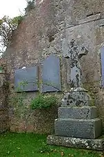 The churchyard also has an armorial stone, as well as a possible fragment of the necking and lower arms of a crude cross, with one side plane and the other side bearing two animals carved into a relief on the lower portion. The graveyard also contains a slab of slate with a foliated cross, with one side preserved but the other side worn away.[2]