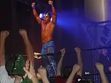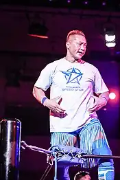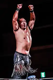 After fifteen successful defenses and a reign of 574 days, Cima lost the Open the Dream Gate Championship to Shingo Takagi on July 21, 2013.[14] During 2014, Cima won both the Open the Triangle Gate and Open the Twin Gate Championship alongside his Veteran-gun stablemates, but lost both titles in first defense.[15][16] On December 3, 2014, after losing the Open the Twin Gate Championship, Cima and Gamma were forced into joining the villainous Mad Blankey stable.[17] As part of the stable, Cima made unsuccessful attempts at recapturing the Open the Triangle Gate Championship.[15] Cima remained a part of Mad Blankey until May 5, 2015, when members of the stable turned on him, costing him a six-way steel cage match, as a result of which he was shaved bald.[18] On June 14, he, Don Fujii and Gamma defeated the Jimmyz (Genki Horiguchi H.A.Gee.Mee!!, Jimmy Susumu and Ryo "Jimmy" Saito) to win the Open the Triangle Gate Championship.[15] On October 8, Cima formed a new unit with Eita, Gamma, El Lindaman, Punch Tominaga, and rookies Kaito Ishida and Takehiro Yamamura.[19] On November 1, the unit was named Over Generation. The same day, he, Gamma, and Don Fujii defended the Open the Triangle Gate Championship against the Jimmyz (Jimmy Susumu, Jimmy K-Ness J.K.S., and Ryo "Jimmy" Saito), and vacated the title afterwards.[20] In the summer of 2016, Cima took part in the 2016 King of Gate, finishing with 6 points and failing to advance to the final.[21] Cima teamed up with Gamma once again for the Summer Adventure Tag League, making it to the semi-finals where they lost to VerserK (Naruki Doi and Yasshi).[22] On November 3, Cima and Dragon Kid captured the Open The Dream Gate Titles, defeating Jimmy Kagetora and Jimmy Susumu in Osaka.[23] The two held the titles for over a year until they were forced to vacate them due to Dragon Kid suffering an injury. Cima found a new partner in Susumu, but the two were unsuccessful in defeating Eita and T-Hawk for the vacant titles at Final Gate in December 2017.[24]