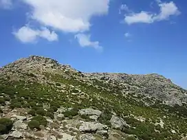 The hike from the village of Olcani climbs for almost 1,000 metres (3,300 ft). At first it follows a track that was meant to cross the cape but has never been paved, which climbs steeply at times to a small chapel in the San Giovanni pass, from where the track leads on to Sisco. A marked path leads towards the Pruberzulu rock, and from there to the summit.[4]