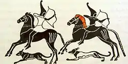 The Cimmerians were a nomadic Iranic people of the Eurasian Steppe.[2][10][11][12][13][14] Archaeologically, there was no difference between the material cultures of the pre-Scythian populations living in the areas corresponding to the Caucasian steppe and the Volga and Don river regions around it, and there were also no other significant differences between the Cimmerians and the Scythians, who were related populations indistinguishable from each other in terms of culture and origins.[15][16]