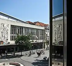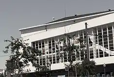 The main stage and exhibition hall occupies the entity of the space, with the "L"-shaped foyer opening to the square and road.[2] The ceilings of the exterior spaces, tribune and balconies are covered stucco with circular, copper lamps.[2] Over the lateral doors that access the theatre balconies are ceramic elements in the forms of polychromatic wings, in bass relief with birds and flowers.[2]