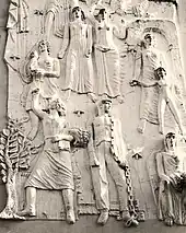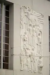 The Novo Salão High-Lifebuilding was demolished in 1944, and on the 30 September of that year, the property-owners ordered the construction of the Cinema Batalha, assigning these duties to the civil engineer Bernardino de Barros Machado.[2] The building was built between 1944 and 1947, and inaugurated on 3 June 1947.[1][2] An examination of the building's construction was performed on 27 September 1948, shortly before the first screenings by the Cineclube do Porto.[2] Due to the censorship of the time, the frescoes by Júlio Pomar and the base-relief by Américo Braga, were ordered removed.