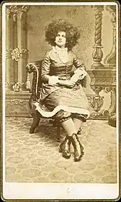 The trend spread, with supposedly Circassian women featured in dime museums and travelling medicine shows, sometimes known as "Moss-haired girls". They were typically identified by the distinctive hairstyle, which was held in place by the use of beer. They also often performed in pseudo-oriental costume. Many postcards of Circassians also circulated. Though Barnum's original women were portrayed as proud and genteel, later images of Circassians often emphasised erotic poses and revealing costumes.[37] As the original fad faded, the "Circassians" started to add to their appeal by performing traditional circus tricks such as sword swallowing.[41]