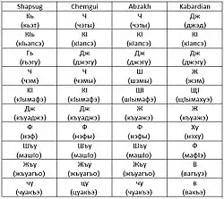 • Adyghe ч ↔ ж Kabardian: чэмы ↔ жэм (cow); чъыгы ↔ жыг (tree); чэщы ↔ жэщ (night); чылэ ↔ жылэ (village, settlement); пчъын ↔ бжын (to count); чъэн ↔ жэн (to run)
