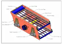 The standard unit is a single-shaft, double-bearing unit constructed with a sieving box, mesh, vibration exciter and damper spring. The screen framing is steel side plates and cross-members that brace static and dynamic forces. At the center of the side plates, two roller bearings with counterweights are connected to run the drive. Four sets of springs are fixed on the base of the unit to overcome the lengthwise or crosswise tension from sieves and panels and to dampen movement.[2] An external vibration exciter (motor) is mounted on the lateral (side) plate of the screen box with a cylindrical eccentric shaft and stroke adjustment unit. At the screen outlet, the flows are changed in direction, usually to 90 degrees or alternate directions, which reduces the exiting stream speed.[4] Strong, ring-grooved lock bolts connect components.[5]