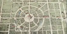 The only drawings of Circleville before its squaring were made by G. F. Wittich. He made sketches of the courthouse, the circle, and other buildings in 1836. Wittich used these drawings along with information from residents to create a map around 1860, of which he produced a watercolour rendition in 1870.[7]:36
