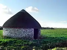 A circular linhay is an ancient type of structure found in England, particularly associated with Devon. Linhay (rhymes with finny), also spelled linny, is a type of farm building with an open front and usually a lean-to roof.[1] In Newfoundland English a linney is similar as a storage space, kitchen, or porch but as an addition to the rear of a house,[2] and in American English it is an open, lean-to shed attached to a farmyard.[3] Linhays were used to store hay above and shelter cattle (cattle linhay) or farm machinery (cart linhay).[4]