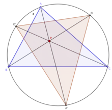 Let P be a point in the plane of the reference triangle ABC. Let the lines AP, BP, CP intersect the circumcircle of triangle ABC at A', B', C'. The triangle A'B'C' is called the circumcevian triangle of P with reference to the triangle ABC.[1]