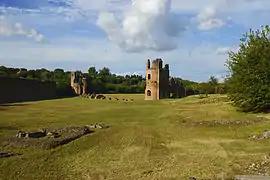 The circus is constructed, after the fashion of many Roman buildings of this period, in concrete faced with opus vittatum.[4] The putlog holes which held the scaffolding are evident in many places in the walls, which stand several metres high in places. The modern-day visitor enters the circus from the west end, where the remains of the two still imposing towers are located. These would have contained the mechanism for raising the carceres (starting gates), which were positioned on an arcuated course between the towers. Once out of the gates, the chariots would race down the track, the full 503 metres (550 yd) length of which can still be seen. The track was excavated in the 19th century by Antonio Nibby, whose discovery of an inscription to the 'divine Romulus' led to the circus being positively identified with Maxentius.[5] The spina, the barrier running down the middle of the track, is exactly 1000 Roman feet (296 m) long, and would have been cased in marble. Its many ornaments, including cones, metae and obelisks, would have cast shadows across the track in the late afternoon sun. In the centre stood the Obelisk of Domitian which Maxentius presumably had moved from the Isaeum as part of the tribute to his son. Covered in hieroglyphs and lying broken in five pieces it was much discussed during the Renaissance and engraved by Etienne du Perac among others. The Collector Earl of Arundel paid a deposit for the pieces in the 1630s and attempted to have them removed to London but Urban VIII forbade its export and his successor Innocent X had it erected in the Piazza Navona by Bernini.[6] The track's outer walls were laid out to be wider at the start to allow the racers to spread out before reaching the spina, and were also made wider at the point of the turn, which accommodated the turning circle of the chariots. At the east end of the track is a small triumphal arch, in which exposed opus vittatum work can be seen. The judges' box was located about two-thirds of the way down on the southern side of the track, where it would have been in clear sight of the finishing line. The imperial box, the remains of which are identifiable, was situated in the usual fashion to give the most dramatic views of the race. Directly opposite the imperial box, in the south track wall, there is a small arch, through which can be seen the Tomb of Caecilia Metella. From the height of the box the tomb would have been entirely visible, and it has been argued that the circus, which is curiously positioned relative to contemporary and existing structures, was purposely skewed in order to integrate the tomb into the Maxentian architectural scheme.[7]