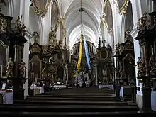 The main altar, the work of Georg Schroetter, was created between 1681 and 1684 and is decorated with two paintings by Michael Willmann, the large one depicting the Nativity as seen by St Bernard, and the upper one, the Saviour of the World. The large painting is surrounded on the left by statues of St. Benedict, St. John the Baptist and St. Peter, and on the right by statues of St. Bernard, St. John the Evangelist and St. Paul. There is a statue of Mother of God with Child in the side altar, called the Mother of the Polish Language. In 1952 she was crowned with bishop's crowns.