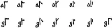 Using graphic substitutes with a vertical stave,[nb 2] the first five digits are ꜒ 1, ꜓ 2, ꜒꜓ 3, ꜓꜒ 4, ꜍ 5. Reversing them forms the tens, ˥ 10, ˦ 20, ˦˥ 30, ˥˦ 40, ꜈ 50. Inverting them forms the hundreds, ꜖ 100, ꜕ 200, ꜖꜕ 300, ꜕꜖ 400, ꜑ 500, and doing both forms the thousands, ˩ 1,000, ˨ 2,000, ˨˩ 3,000, ˩˨ 4,000, ꜌ 5,000. Thus ⌶ (a digit 1 at each corner) is the number 1,111. (The exact forms varied by date and by monastery. For example, the digits shown here for 3 and 4 were in some manuscripts swapped with those for 7 and 8, and the 5's may be written with a lower dot (꜎ etc.), with a short vertical stroke in place of the dot, or even with a triangle joining to the stave, which in other manuscripts indicated a 9.)[13][1]