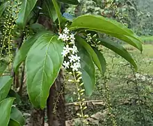 It is a tree that reaches a height of up to 15 m (49 ft). The ovate to elliptic leaves are 4–20 cm (1.6–7.9 in) long and have orange petioles. Small white flowers are produced throughout the year on hanging axillary and terminal racemes and panicles 20–40 cm (7.9–15.7 in) in length. The fruit are red to black subglobose drupes 7–10 mm (0.28–0.39 in) in diameter.[3]