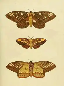 The moths are relatively large, with a 130-mm wingspan. They do not have a prominent discal spot, neither on fore or hindwing. Females are yellowish black, with orange-red venation.[3] Males look similar, however they are smaller at 110-115-mm wingspan on average. The venation is more vivid and pronounced, however. Their hindwings are highly variable, ranging from yellow with a brown band to mostly red with yellow patches and brown stripes. Their abdomen are yellow, with a red dorsal side and sometimes have red flecks on the side.