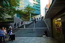 The plaza has an area of 6,000 sq ft (560 m2).[60] Its presence allowed the tower to be designed with a maximum floor area ratio of 18:1, higher than the 15:1 ratio specified for the area.[27] The plaza is accessed by a set of stairs extending northeast from the corner of Lexington Avenue and 53rd Street.[54][61] On the south side of the plaza is an entrance to the Lexington Avenue/51st Street subway station.[62][63] This subway entrance replaces two staircases from the street, which were demolished to make way for Citicorp Center.[54] The north side of the plaza contains the entrance to St. Peter's Church and the east side contains an entrance to the lower lobby.[64] During the plaza's construction, the developers collaborated with the numerous public agencies with a stake in the project, including the Metropolitan Transportation Authority, which operated the subway station.[34]