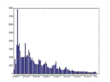 In March 2010, the project had 90 contributors who made at least one edit, with a core of 25 contributors who made more than 100 edits. Median word count dropped from 468 words per article in October 2007 to 151 in May 2010.[63] In June 2010, the number of users making 1, 20, or 100 edits per month all were at their lowest point since the project went public in March 2007.[63] By October 2011, only about a dozen members made edits on a typical day, and an Ars Technica headline called the Citizendium project "dead in the water".[1] In 2014, the number of Citizendium contributors was under 100 and the number of edits per day was about "a dozen or so" according to Winthrop University's Dean of Library Services.[64] In September 2015, only seven editors had been active in the previous 30 days.[65]