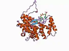 Citrate synthase enzymes are found in two distinct structural types: type I enzymes (found in eukaryotes, Gram-positive bacteria and archaea) form homodimers and have shorter sequences than type II enzymes, which are found in Gram-negative bacteria and are hexameric in structure. In both types, the monomer is composed of two domains: a large alpha-helical domain consisting of two structural repeats, where the second repeat is interrupted by a small alpha-helical domain. The cleft between these domains forms the active site, where both citrate and acetyl-coenzyme A bind. The enzyme undergoes a conformational change upon binding of the oxaloacetate ligand, whereby the active site cleft closes over in order to form the acetyl-CoA binding site.[1] The energy required for domain closure comes from the interaction of the enzyme with the substrate. Type II enzymes possess an extra N-terminal beta-sheet domain, and some type II enzymes are allosterically inhibited by NADH.[2]