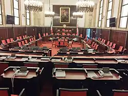 The current Council meeting room was inaugurated on 30 June 1953. A ciceronian inscription from the previous meeting place of the Council – the notorious Sala Alessi on the second floor of the palace – is reported on the marble walls around the room:
