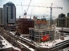 Demolition of the site's old structures commenced in November 2006. By February 2007, the Inn at Temple Square had been completely demolished and work was underway to demolish the old parking structure for the Crossroads Plaza Mall. The destruction proceeded across the site from west to east, with several businesses remaining open until a short time before their scheduled demolition. Macy’s and Nordstrom had both closed by early February 2007. On August 18, 2007 the twenty-story Key Bank Tower was imploded and was one of the final steps to demolition completion. Demolition was completed by the end of 2007, and was followed by another six months of excavation and site preparation. By July 2008, most of the below-surface structures of the Crossroads block located to the southeast of the Main and South Temple streets intersection were complete. The parking structure beneath the future Nordstrom site was complete on the southwestern corner of the block. The central core of the thirty-two story condo tower, as well as the base-work for three additional residential structures located along the northern edge of the block, had begun initial construction by mid-2008.[20]