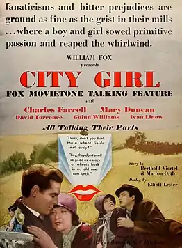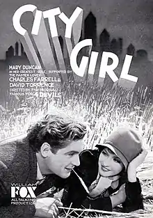 City Girl is a 1930 American silent film directed by F. W. Murnau, and starring Charles Farrell and Mary Duncan. It is based upon the play "The Mud Turtle" by Elliot Lester. Though shot as a silent feature, the film was refitted with some sound elements and released in 1930.[1][2] The film is credited as being the primary inspiration for Terrence Malick's film Days of Heaven (1978).[1][2]