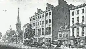 Upon its closing on April 30, 1849, the New York Herald wrote: "In times gone by, it was the first hotel of the country, and the great men of the country always patronized it … ". It was once owned by Ezra Weeks. In 1828 John Jacob Astor bought it. He gave it to a granddaughter, Sara Langdon, who married Francis Robert Boreen in 1834, as a dowry. In 1849–50 she replaced it with a block of stores called the Boreel Building, and in 1878–79 replaced that with an office building, also called the Boreel Building.[9][10]