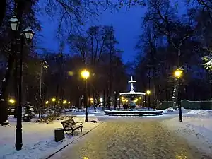 City Park is a park in Kyiv located between Khreshchatyi Park and Mariinskyi Park. Along with Volodymyr Hill, Khreshchatyi Park, Mariinskyi Park, Askold's Grave, and Park of the Eternal Glory, it creates one big elongated park zone along the right bank of Dnieper. The park has an area of 11.7 ha (29 acres). The main feature of the park is a sports venue, Lobanovsky Dynamo Stadium.